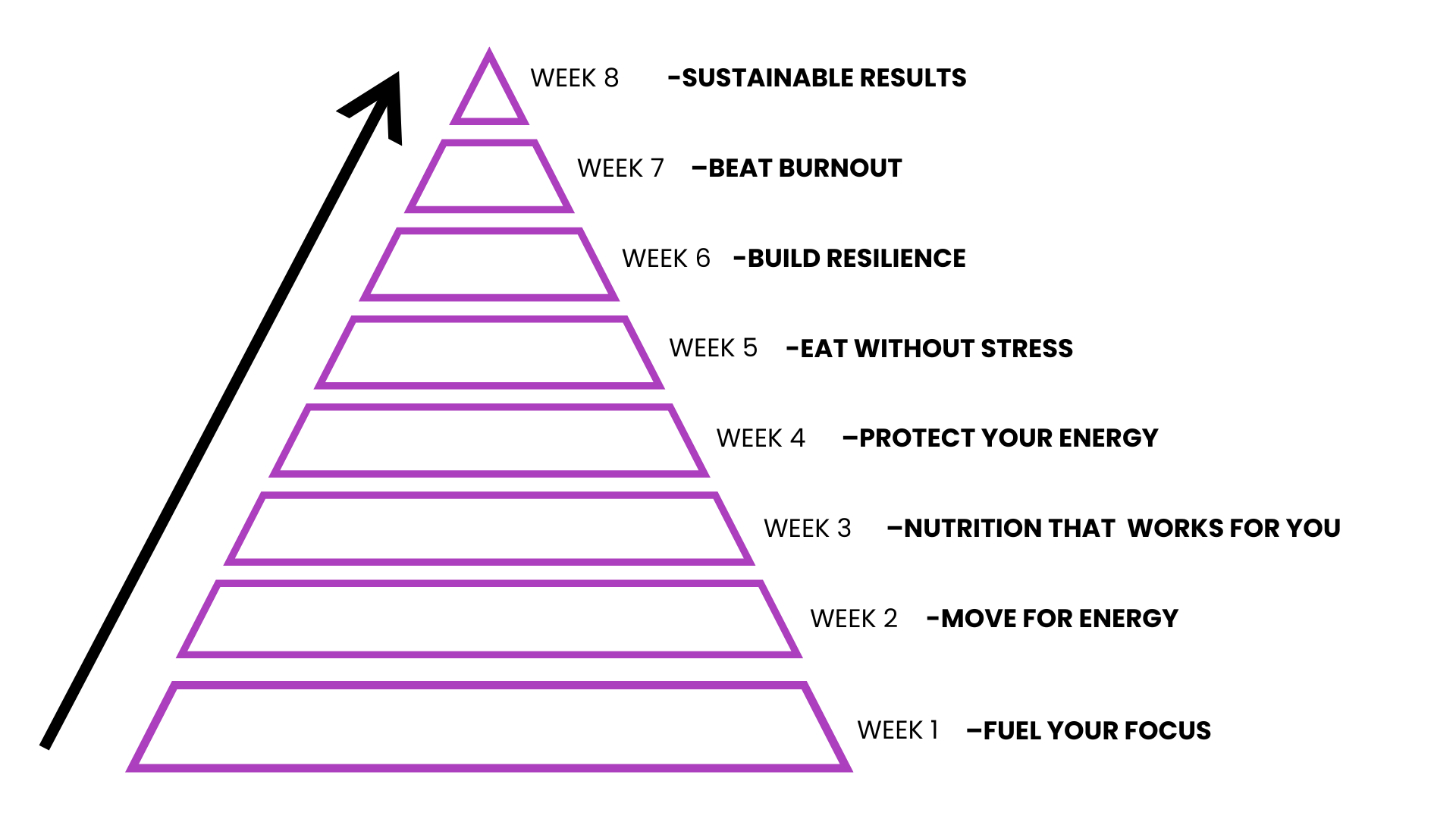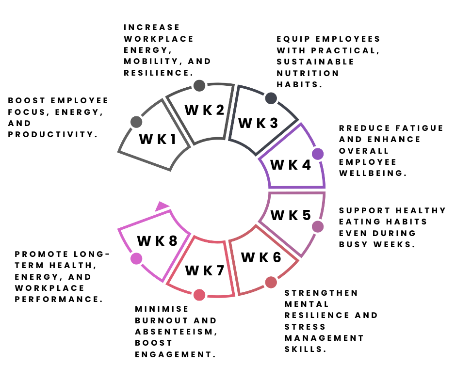 The Corporate Vitality programme layers essential behaviours, starting with nutrition and energy foundations, to build focus, resilience, and sustainable performance. Participants typically see improvements in energy, focus, stress management, and daily habits during the 8-week programme — with benefits that continue to grow as these habits are maintained.
